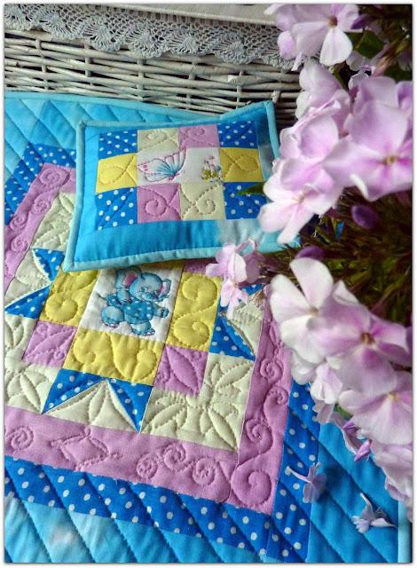 Когда отставание от проекта стало катастрофическим, подушку захотелось выстегать машинкой...но рука сама потянулась за иголкой и розовой ниткой. Розовая нить из-за того, что нужно было простегать бабочку по контуру, а он розовый. На одеялке стежка светло бежевой нитью.
